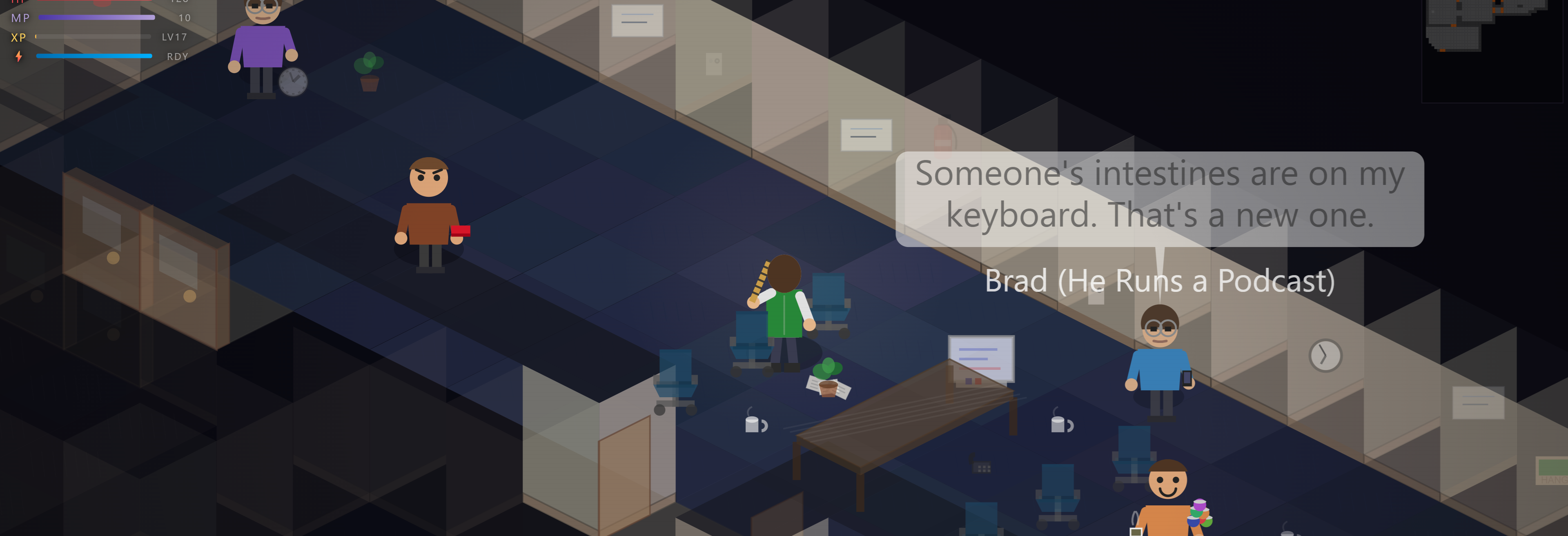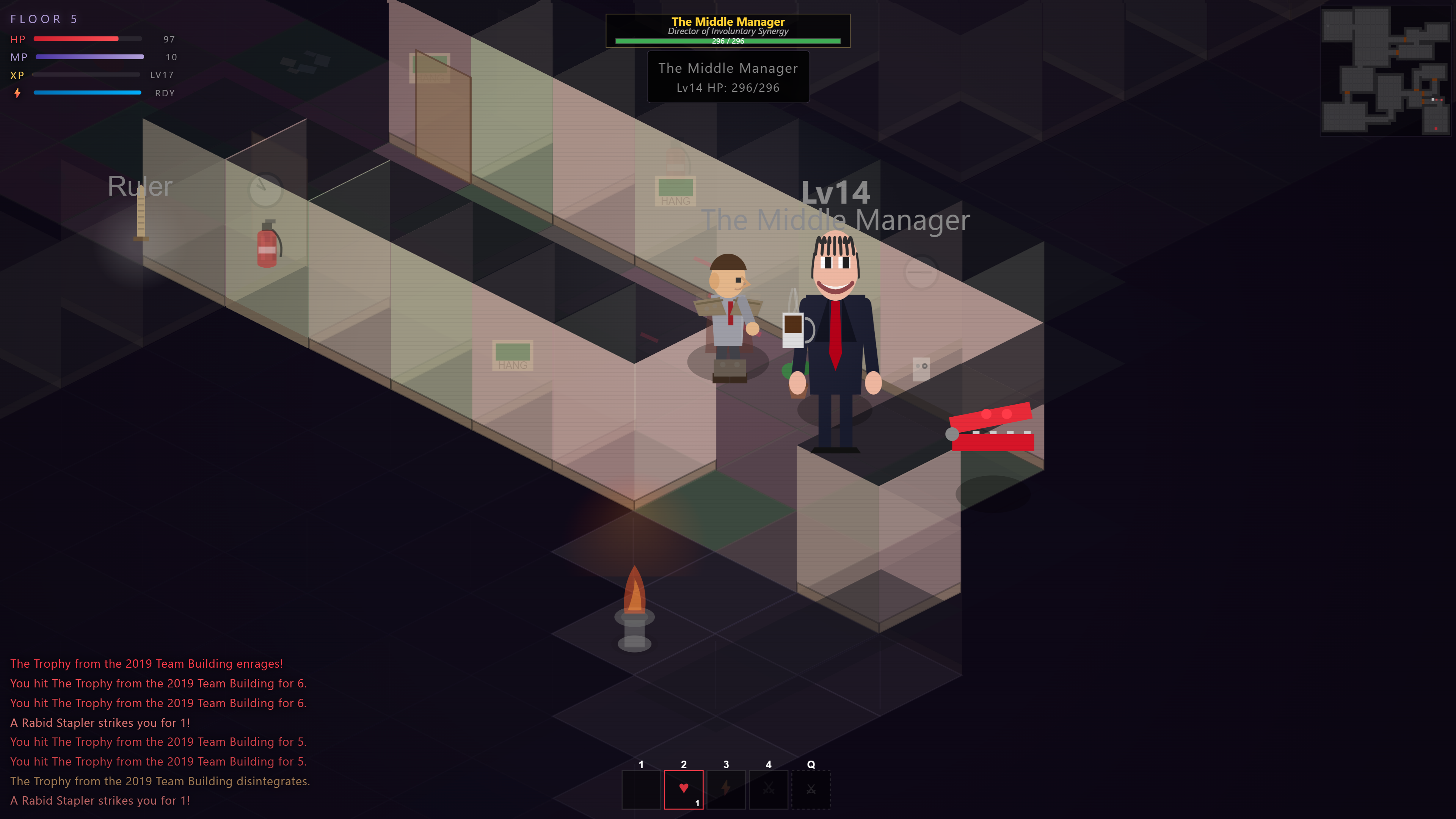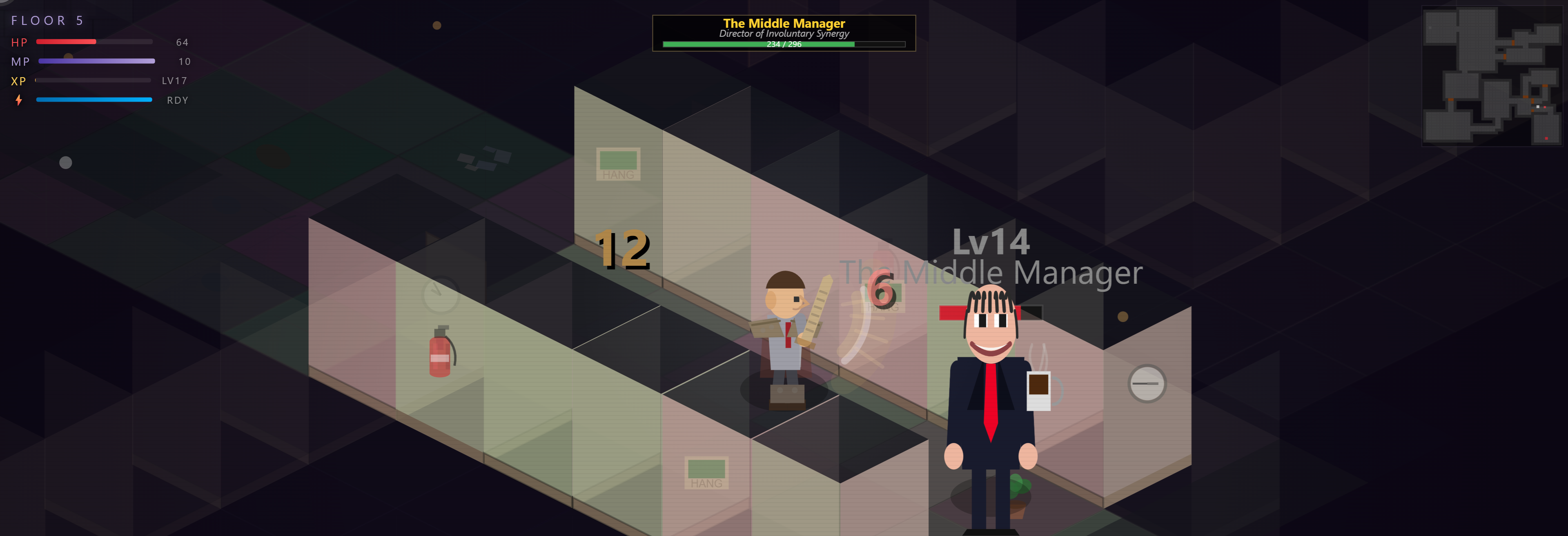 - Fights against middle management (they have titles and phases)